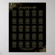 This beautiful wedding seating chart includes table assignments for 250 guests with 10 guests per table. The design is simple yet elegant featuring gold text on a black background with lacy faux foil floral filigree in the corners, and calligraphy script reading: please find your table.