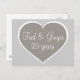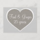This postcard features a solid silver heart outlined in white featuring the names of the bride and groom and the words "25 years" in a cursive white font. Personalize the text with your names, wedding date, or other text. Click "Customize it!" to re-size/re-position silver heart image and/or change background color. Add personalized text to reverse side of card. Choose font style and color; adjust text size and layout. Great for a 25th wedding anniversary celebration.