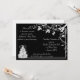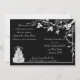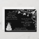 Elegant 25th anniversary party invitation with silver cake on black background and white floral embellishment.