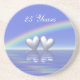 Elegant sandstone coaster with my original artwork of two silver hearts floating on the water under a rainbow with text that says "25 Years".