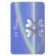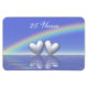 A magnet with an image of two silver-colored hearts floating on peaceful waters, under a rainbow and blue skies with customizable text that says "25 Years".