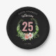 Chic 25th or any age birthday paper plate with a blush pink floral wreath design on a black background. Personalise with your name, age and text.