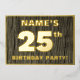 The front of this bold twenty-fifth birthday party/celebration foil invitation card features a personalised name, a large number “25th”, the message “BIRTHDAY PARTY!”, and a border, all in foil. There is a rustic, yet sophisticated, faux wood grain appearance inspired pattern for the background of the front. The back features personalised details about the event, such as the date, time, venue/location, and any other relevant information. Customisable invitations like these might be used to invite attendees/guests to a birthday party being held in celebration of somebody’s 25th birthday. [~Z0000598]