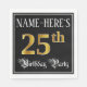 This ornate and fancy birthday paper napkin design features a customizable name and the message “25th Birthday Party”. The large number “25th” has an imitation/faux gold-inspired coloring pattern, and the words “Birthday Party” are in opulent script-style text. The background is colored black by default (although it can be customized). Opulent, luxurious paper napkins like this might be used at a birthday celebration being held in celebration of somebody’s twenty fifth birthday. [~Z0000565]