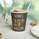 This luxurious and elegant birthday themed paper cup design features a customisable name and the message “25th Birthday Party”. The large number “25th” features a faux/imitation gold-inspired colouring pattern, and the words “Birthday Party” are in ornate script-style text. The background has a faux/imitation woodgrain-inspired appearance. Opulent, fancy paper cups like this might be useful at a birthday celebration/party being held to honour somebody’s 25th birthday. [~Z0000568]