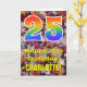 The front of this colourful, nature-inspired, and autumn-themed birthday greeting card design features a large number "25" with a rainbow spectrum gradient inspired pattern, along with the message "Happy 25th Birthday,", and a customisable name. The front features a background depicting rustic fallen autumn leaves. The inside features a customisable birthday greeting message, or could perhaps be cleared and left blank if a message is to be written by hand instead. A customisable birthday card like this might be a fun way to acknowledge somebody’s twenty fifth birthday. [~Z0000384]