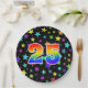 This cheerful, fun, and colourful paper plate design features a large number "25" containing a rainbow spectrum gradient inspired pattern. The background features a colourful pattern of star shapes. Paper plates like this might be fun to use at a celebration being held to honour somebody who is celebrating their 25th birthday, or a couple’s twenty fifth anniversary, or some other 25th event. [~Z0000493]