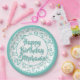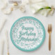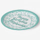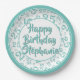 This numeric design has a teal and white random number pattern with a teal milestone number 25 repeated in varied sizes and angles. There is a white circle in the centre for your text and teal-and-white rings around the rim.