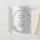 A faux silver looking background. Decorated with greenery and an oval frame. Personalise and add a name and details.
