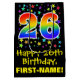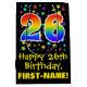 This fun, colourful, and vibrant birthday themed gift bag design features a large number "26" with a rainbow spectrum gradient style pattern, along with the message "Happy 26th Birthday,", and a customisable recipient name. It also has a colourful background pattern featuring star shapes of various sizes. A gift bag like this might be used when giving a gift or present in honour of somebody’s 26th birthday. [~Z0000510]