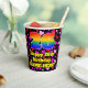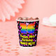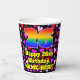 This fun and joyful birthday themed paper cup design features a large number “26” with a rainbow spectrum gradient inspired pattern, along with the message “Happy 26th Birthday,”, and a customisable name. The background features a pattern of pink, purple, and red heart shapes of various sizes. Fun, loving paper cups like this might be fun to have at a birthday celebration being held in celebration of somebody’s 26th birthday. [~Z0000548]