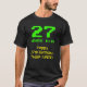 This silly and geeky shirt design has the message "27 YEARS OLD!", the birthday greeting message "Happy 27th Birthday,", and an editable name. The upper age digits and text have a nerdy, green, pixelated, 8-bit graphics style appearance inspired by that of 80s era computer games and classic video games. The lower greeting message features a geeky, yellow, retro digital computing inspired look. Shirts like this might be worn by the guests at a birthday party being held to celebrate the 27th birthday of somebody who really likes old video games or old computers. [~Z0000455]