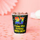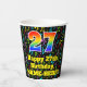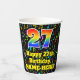 This exciting and fun music themed birthday paper cup design features a large number “27” having a rainbow spectrum gradient inspired pattern. It also features the message “Happy 27th Birthday,”, and a personalised name. The background features a multicolored pattern of various music notes and symbols having a variety of colours and sizes. Colourful, vibrant paper cups like this might be fun to have at a birthday celebration/party being held to celebrate somebody’s twenty seventh birthday. [~Z0000541]