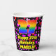 This colourful and happy birthday themed paper cup design features a large number “27” having a rainbow spectrum gradient inspired pattern. It also features the message “Happy 27th Birthday,”, and an editable name. The background features a pattern of red, purple, and pink heart shapes of various sizes. Fun, joyful paper cups like this might be fun to have at a birthday party/celebration being held to honour somebody’s 27th birthday. [~Z0000548]