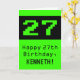 This fun and geeky birthday-themed greeting card design features a large green vintage computer gaming style number "27" on the front. It also features the birthday greeting message "Happy 27th Birthday,", and an editable name. The inside features a customizable birthday greeting message, or could perhaps be cleared and left blank if a message is to be written by hand instead. A silly birthday greeting card like this might be used to send birthday wishes to an engineer, a computer programmer, or somebody who enjoys 8-bit computer gaming and who is celebrating their twenty seventh birthday. [~Z0000430]
