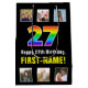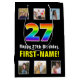 This bold and fun birthday-themed gift bag design features a large number “27“ having a colourful rainbow spectrum inspired gradient pattern, along with the message “Happy 27th Birthday,“ and a personalised recipient name. Above and below the message are some photos that can be personalised, perhaps with photos of the recipient, the recipient’s family and friends, and/or the sender(s) of the gift. A birthday themed giftbag like this might be a fun way to wrap a present being given to somebody who is celebrating their twenty-seventh birthday. (Photography © Storytree Studios, Stanford, CA.) [~Z0000669]