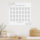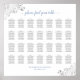 This beautiful wedding seating chart features a simple yet elegant design with dark gray and light blue text on a white background. The title is written in script calligraphy lettering and reads: please find your table. The chart is decorated with a frilly floral faux foil silver curls and swirls in the corners. Contains seating assignments for 28 tables at 10 guests per table or 280 guests.
