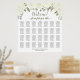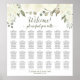This beautiful 28 table wedding seating chart features a hand painted watercolor design with ivory, white, or cream colored roses, flowers, and blossoms, along with sage green eucalyptus leaves and garden foliage. The elegant script calligraphy title reads "Welcome! please find your table". The seating chart has space for 280 guests with 10 seats per table, and there is room for the names of the couple and wedding date at the bottom. Wonderful way to welcome your guests to your reception while making it easy for them to find their seats.
