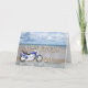 A blue motor cycle standing on a beach with fluffy clouds in the sky. Happy Birthday written in rock reflected in the water lying on the sand.