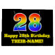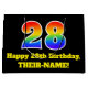 This fun and colourful birthday themed gift bag design features a large number "28" having a rainbow spectrum gradient inspired pattern. It also features the message "Happy 28th Birthday,", and a customisable name. It also has a black-coloured background. A vibrant birthday themed gift-bag like this might be a fun way to wrap a gift or present being given to somebody who is celebrating their 28th birthday. [~Z0000521]