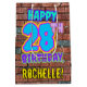 The front of this fun birthday themed gift bag design features the message “HAPPY 28TH BIRTHDAY,” having a colourful, vibrant, urban street art and graffiti inspired appearance, in addition to a customisable recipient name. The background features a brick wall inspired pattern. A vibrant gift bag like this might be used when giving a gift or present in honour of somebody’s 28th birthday. [~Z0000536]