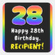 This joyful and upbeat birthday square sticker design features a large number “28“ having a vibrant multicolored rainbow spectrum inspired gradient pattern, along with the message “Happy 28th Birthday,”, and a personalised recipient name. Stickers like these might be used when celebrating somebody’s twenty eighth birthday. [~Z0000630]