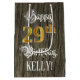 This opulent and luxurious birthday themed gift bag design features the message “Happy 29th Birthday,”, plus a personalised recipient name. Some of the message is in ornate script-style text. The large number “29th” features a faux/imitation gold-inspired look pattern. The background has an imitation/faux woodgrain-inspired pattern. An elegant giftbag like this might be used when wrapping presents being given to somebody in celebration of their 29th birthday. [~Z0000562]