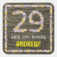 This rustic, fun, nature-inspired birthday square sticker design features the message “Happy 29th Birthday,” and an editable recipient name. The large number “29” and the border consist of flower icons. The background has an imitation woodgrain style pattern. Stickers like these might be used when celebrating somebody’s twenty-ninth birthday. [~Z0000654]