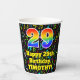 This cheerful and exciting music themed birthday paper cup design features a large number “29” with a rainbow spectrum gradient inspired pattern, along with the message “Happy 29th Birthday,”, and a customisable name. The background features a colourful pattern having music notes and symbols of various colours and sizes. Colourful, vibrant paper cups like this might be fun to have at a birthday celebration being held to celebrate somebody’s 29th birthday. [~Z0000541]