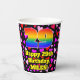 This cheerful and joyful birthday themed paper cup design features a large number “29” having a rainbow spectrum gradient inspired pattern. It also features the message “Happy 29th Birthday,”, and a custom name. The background features a pattern of red, pink, and purple heart shapes. Friendly, loving paper cups like this might be fun to use at a birthday celebration being held in celebration of somebody’s twenty ninth birthday. [~Z0000548]