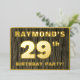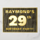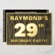 The front of this bold twenty-ninth birthday celebration foil invitation card features a custom name, a large number “29th”, the message “BIRTHDAY PARTY!”, and a border, all in foil. The background of the front features a rustic, yet sophisticated, faux wood grain appearance inspired pattern. The back features personalised details about the event, such as the date, time, location/venue, and any other information that may be relevant. Personalised invitations like these might be used to invite guests to a birthday party/gathering being held to celebrate somebody’s 29th birthday. [~Z0000598]
