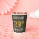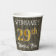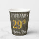This fancy and luxurious birthday themed paper cup design features a custom name and the message “29th Birthday Party”. The large number “29th” features an imitation/faux gold-inspired coloring pattern, the words “Birthday Party” are in ornate script-style text, and the background has an imitation/faux woodgrain-inspired pattern. Opulent, elegant paper cups like this might be used at a birthday celebration being held to honor somebody’s 29th birthday. [~Z0000568]