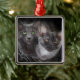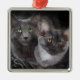 2 cats green eyes orange eyes grey cat black cat metal tree decoration