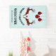 A banner which say "Merry Christmas" in curved text. Designed with an illustration of 2 Christmas deer jumping. Deer are made of red and black lumberjack plaid, with a little heart in between them. Red and black plaid Christmas decorations hang down from the top. Light blue background.