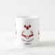 A personalised mug which say "Merry Christmas" in curved text. Designed with an illustration of 2 Christmas deer jumping. Deer are made of red and black lumberjack plaid, with a little heart in between them. Red and black plaid Christmas decorations hang down from the top.