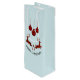 A wine gift bag which says "Merry Christmas" in curved text. Designed with an illustration of 2 Christmas deer jumping. Deer are made of red and black lumberjack plaid, with a little heart in between them. Red and black plaid Christmas decorations hang down from the top. Light blue background.
