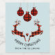 A personalised wine bottle label which says "Merry Christmas" in curved text. Designed with an illustration of 2 Christmas deer jumping. Deer are made of red and black lumberjack plaid, with a little heart in between them. Red and black plaid Christmas decorations hang down from the top.