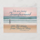 Beautiful inspirational quote scripture custom postcard depicts a girl walking on an ocean beach at sunset. It features Bible Verse 2 Corinthians 3:18, We are being transformed into His image from Glory to Glory. The greeting/prayer can be modified or deleted for a blank card.~