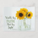 Inspirational quote floral postcard depicts beautiful yellow sunflowers in a vase and features Bible Verse 2 Corinthians 5:7, "Walk by faith not by sight." _