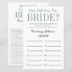 This lovely bridal shower games sheet with How Old Was the Bride? on the front and How Well Do You Know The Bride? on the back is simple and charming - perfect for your shower. These fun and easy games are sure to bring lots of laughter to your bridal shower! Have family and friends send you pictures of the bride at all different ages and have them printed. Number them and set them near these game sheets. Simply give a sheet to each guest (don't forget the pens) and let the competition begin for the first game! You'll be amazed at how many people really know the ages of the bride. Then flip the sheet and give guests 5 minutes to answer the questions. You'll find out who really does know the bride. In seconds you can see how your game sheet will look. Simply select Personalise this Template and type in the names of the bride.and groom.