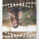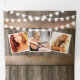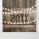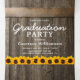 A 2 in 1 rustic country graduation party trifold invitation featuring a rustic wooden barrel background, twinkle string lights, bright yellow sunflowers, photos of the graduate, the class year, graduation celebration details, and an rsvp postcard for your guests to cut off and send back.