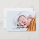 Simple birth announcement card with welcoming wording that provides the newborn's name and birth information. There are three photographs on the front and one on the back, as well as a short statement.
