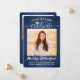 Share the joy of a high school or college graduation with these custom 2 photo navy blue, white and silver announcements. (IMAGE PLACEMENT TIP: An easy way to centre a picture exactly how you want is to crop it before uploading to the Zazzle website.) This template includes graduate name, class year & school, and is simple to customise with any wording of your choice, such as party invitation details, parents' names, special honours, degree title, favourite inspirational quote, graduate's contact info, future education plans, or new job position. If there's any text not wanted simply delete it. Design features a dark blue brushed background, faux foil mortar board cap, handwritten style script calligraphy, modern minimalist typography, and two photos of your choice, such as senior pictures or images from the commencement ceremony. Please note that background is printed colour not metallic foil. These elegant graduation announcement cards are a stylish way to share your special day celebration with family and friends. Congratulations to the graduate!