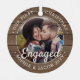 Celebrate the joyful 1st holiday of your engagement with a custom 2 photo "Our First Christmas Engaged" faux wood round metal ornament. All wording and images on this template are simple to personalise. (IMAGE & TEXT DESIGN TIPS: 1) To adjust position of wording, add spaces at beginning or end. 2) To centre the photo exactly how you want, crop it into a square shape before uploading to the Zazzle website.) As an idea, the script typography can read "Together" or "Married." The modern farmhouse style design features a rustic brown faux wood border, handwritten style calligraphy, the couple's names & year, and two pictures of your choice. This unique wedding keepsake adds an elegant touch to Xmas home decorations.