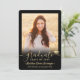 Share the joy of a high school or college graduation and invite family and friends to celebrate with these custom 2 photo black and gold invitations. All pictures and wording are simple to personalise. (IMAGE PLACEMENT TIP: An easy way to centre a photo exactly how you want is to crop it before uploading to the Zazzle website.) This template is formatted for a graduation party, but can easily be changed to an open house or any type of event. If just an announcement card is preferred, simply change the text to include any details of your choice, such as parents' names, special honours, degree title, graduate's future plans & contact info, or favourite inspirational quote. If there's any text not wanted simply delete it. Design features a faux gold foil graduation cap, handwritten style script calligraphy, modern minimalist typography, and two photos of your choice, such as senior pictures or images from the commencement ceremony. Please note that gold is printed colour, not metallic foil. This elegant graduation invitation card is a trendy and chic way to begin your special day celebration. Congratulations to the graduate!