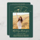 Share the joy of a high school or college graduation with these custom 2 photo green and gold announcements. (IMAGE PLACEMENT TIP: An easy way to centre a picture exactly how you want is to crop it before uploading to the Zazzle website.) This template is simple to customise with any wording of your choice, such as party invitation details, parents' names, special honours, degree title, favourite inspirational quote, graduate's contact info, future education plans, or new job position. If there's any text not wanted simply delete it. Design features a green ombre background, faux foil mortar board cap, handwritten style script calligraphy, modern minimalist typography, and two photos of your choice, such as senior pictures or images from the commencement ceremony. Please note that gold is printed colour, not metallic foil. These elegant graduation announcement cards are a trendy and chic way to share your special day celebration with family and friends. Congratulations to the graduate!