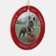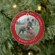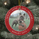 Celebrate the simple joys of your furry family member with this custom 2 photo round ceramic ornament. Text and dog pictures on this template are simple to personalise and can be different or the same on front and back. If preferred, change "Peace Love Joy Treats" to any quote or saying. (IMAGE & TEXT DESIGN TIPS: 1) To adjust position of wording, add spaces at beginning or end. 2) To centre the photo exactly how you want, crop it into a square shape before uploading to the Zazzle website.) Ornament can also be used for any pet, such as a cat or hamster; or as a My First Christmas or memorial. Modern minimalist design features a festive red and white border, stylish typography name and year, and 2 images of your choice. This unique dog lover keepsake adds an elegant touch to Xmas home decorations.