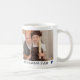 Coffee mug for grandpa personalised with two photos of grandpa and the grandkids. This mug belongs to the best grandpa ever is written in a charming hand writing font between two blue hearts.