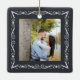 Celebrate the joyful 1st holiday of your engagement with our "2 Photos Ornamental Frame First Christmas Together" square ceramic ornament. This design features a simple and stylish white ornament frame on a black backdrop, handwritten style calligraphy, the couple's names, and two photos of your choice. This unique wedding keepsake adds an elegant touch to Xmas home decorations.