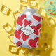 happy Valentine's Day can coolers with a repeating pattern of 2 different sized red hearts each heart surrounded by a white border. A diamond shaped frame layered over top with your text inside.